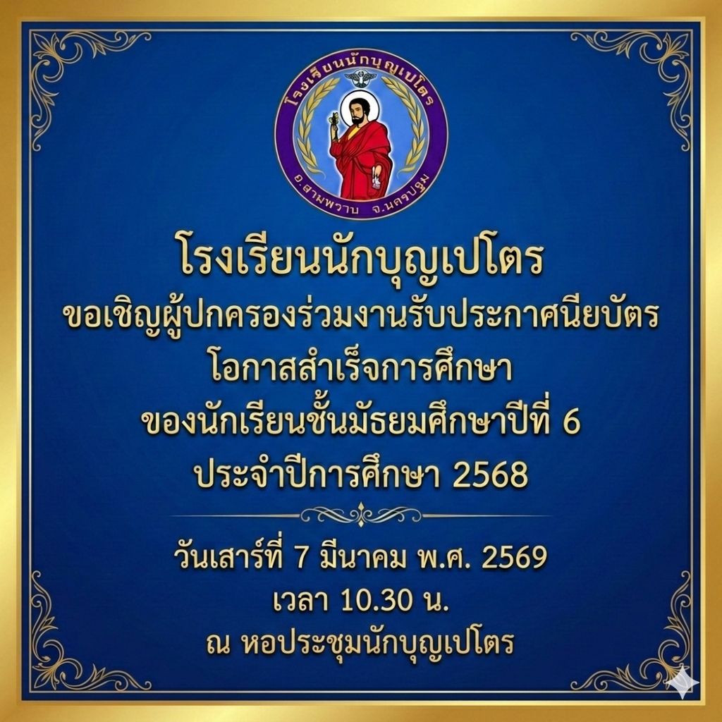 ขอเชิญผู้ปกครองร่วมงานรับประกาศนียบัตรโอกาสสำเร็จการศึกษาของนักเรียนชั้นมัธยมศึกษาปีที่ 6 ประจำปีการศึกษา 2568 2 มีนาคม 25694 เมษายน 2026 admin ข่าวประชาสัมพันธ์ admin