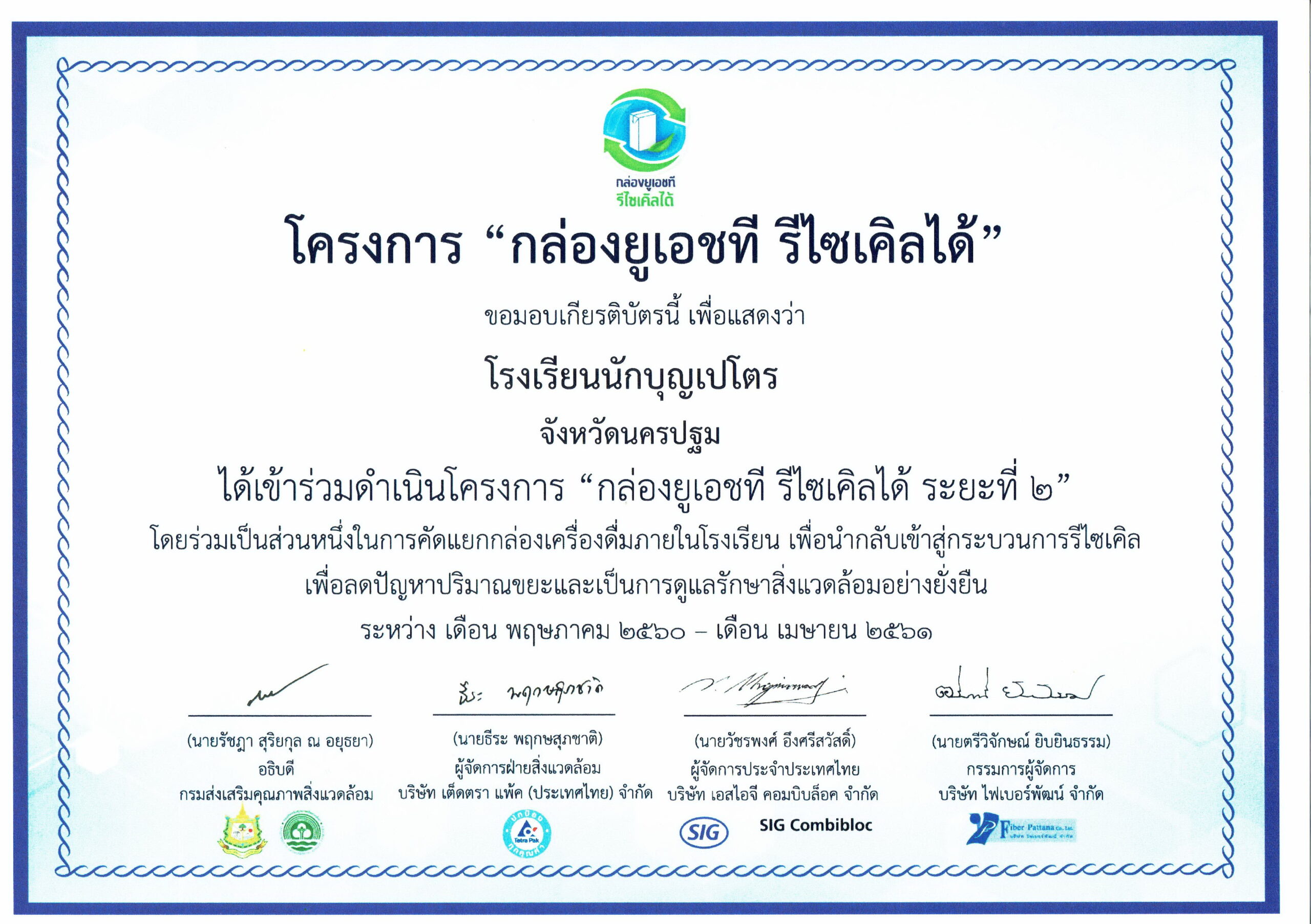 เกียรติบัตรเพื่อแสดงว่า โรงเรียนนักบุญเปโตร ได้เข้าร่วมดำเนินโครงการ “กล่องยูเอชที รีไซเคิลได้ ระยะที่ 2” โดยร่วมเป็นส่วนหนึ่งในการคัดแยกกล่องเครื่องดื่มภายในโรงเรียน เพื่อนำกลับเข้าสู่กระบวนการรีไซเคิลเพื่อลดปัญหาปริมาณขยะและเป็นการดูแลรักษาสิ่งแวดล้อมอย่างยั่งยืน ระหว่าง เดือน พฤษภาคม 2560 – เดือน เมษายน 2561