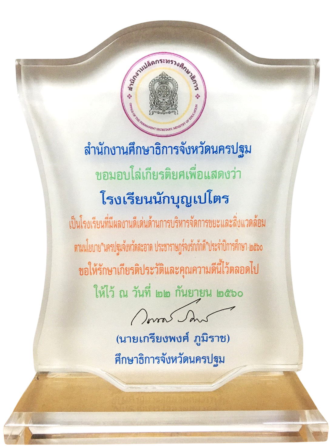 โล่เกียรติยศเพื่อแสดงว่าโรงเรียนนักบุญเปโตร เป็นโรงเรียนที่ผลงานดีเด่นด้านการบริหารจัดการขยะและสิ่งแวดล้อมตามนโยบาย “นครปฐมจังหวัดสะอาด ประชาราษฎร์จงรักภักดี” ประจำปีการศึกษา 2560 ให้ไว้ณวันที่ 22 กันยายน 2560 ศึกษาธิการจังหวัดนครปฐม